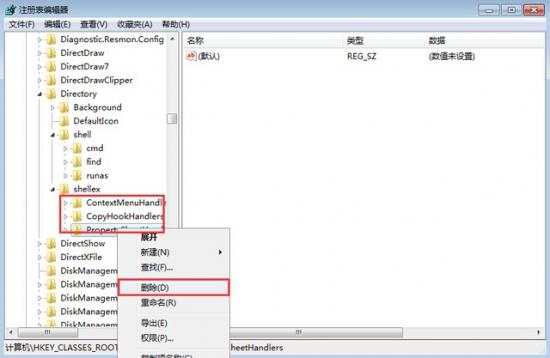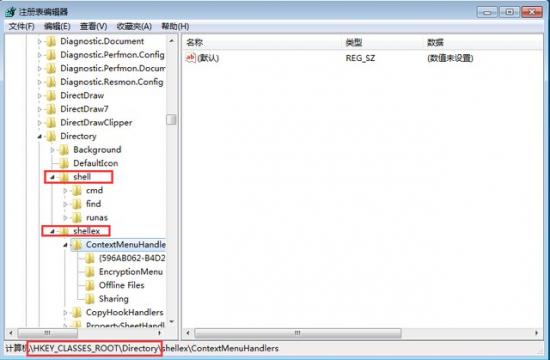 2、展开HKEY_CLASSES_ROOT\\Directory\\Shell和HKEY_CLASSES_ROOT\\Directory\\Shellex\\ContextMenuHandlers,如图所示: