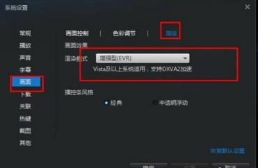 打开迅雷看看的系统设置,点击画面——高级,在渲染模式中设置增强型即可。