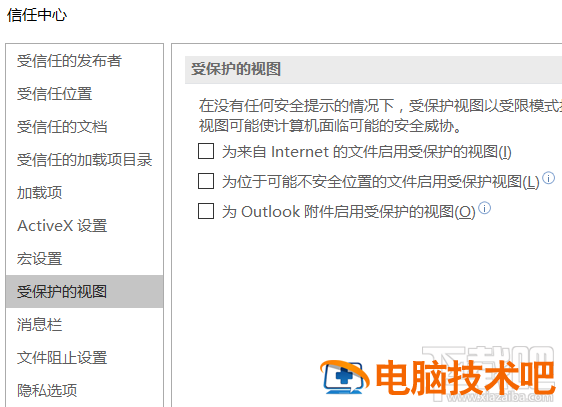 同样,点选左侧“受保护的视图”,然后再右侧取消勾选三项设置,这时文档应该就可以打开了。