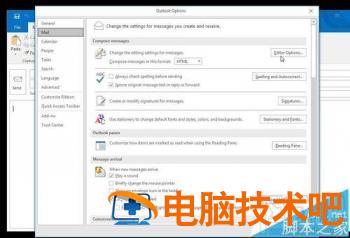 3、此时跳出“outlook选项” 对话框。见图。点击“邮件”mail,然后点击"编辑选项..." Editor Options...