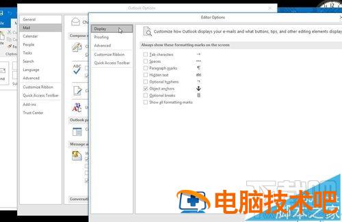 4、在弹出的"编辑选项..." Editor Options 对话框中,左侧有"显示" Display,点击,即可看见 "段落标注"Paragraph marks, 不要选择该选项即可剔除回车符号。其他的选项也可按照个人需要勾选。完毕。