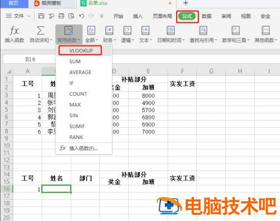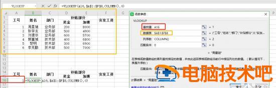 3.姓名列下单元格,公式,插入公式vlookup。数据表:全选表格后,按F4可以快速转换成绝对引用。