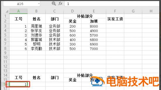 2.工号列下输入1。