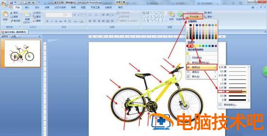 点击开始——在绘图中选择单箭头——画在自行车的相关部位那里。