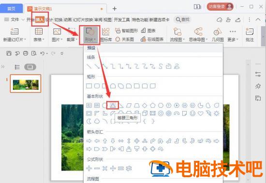 接着,我们在【插入】-【形状】里面找到【等腰三角形】,如图所示。