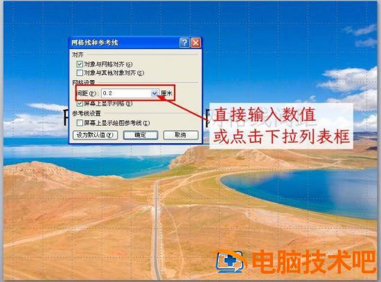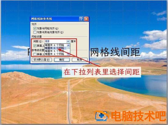 在打开的网格和参考线对话框中的间距处,可以直接输入相应间距数值,或点击右侧下拉列表框。