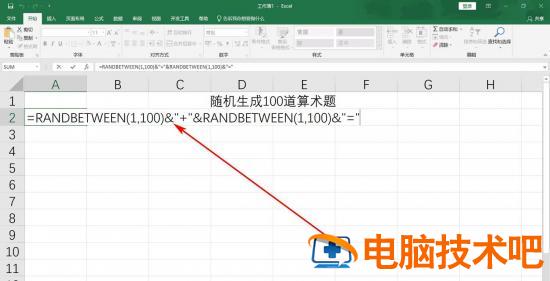 3、然后,输入=RANDBETWEEN(1,100)&"+"&RANDBETWEEN(1,100)&"="。
