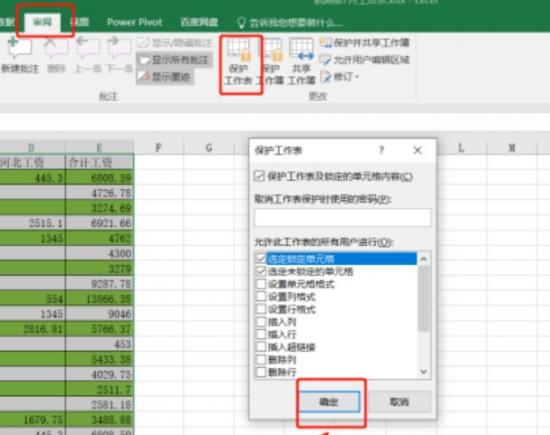 5、回到表格,依次点击菜单栏里的【审阅】-【保护工作表】,在弹出的窗口中,点击【确定】,如下图;