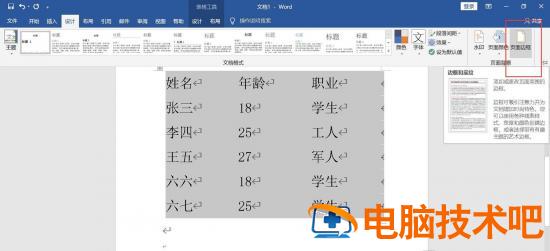 选中整个表格,点击菜单栏上“设计-页面边框”。