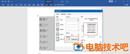 在打开的对话框里选择“边框”界面,在宽度位置选择粗的线条,并点击预览框里的上下两边,添加粗线。
