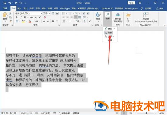 选中文字,点击【开始】-【编辑】-【替换】。