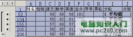 观察本例各班;总分”的平均分,发现2班的成绩劣于4班。如此周密地分班,为什么还会出现这种情况呢?只要按;分班”;计数”;分班”的方式重新进行分类汇总,就会发现2班、4班分别是51人,49。原来,在按轮次分班时,;尾子”学生在2班多;轮”了1次。另外,1班与2班相比,语文、数学强而英语弱