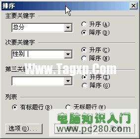 ”中选择;总分”,在其右侧选择;降序”,在;次要关键字”下拉列表中选择;性别”,在其右侧选择;升序”,单击;确定”,完成排序。参见图2。