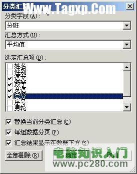 复制A2:J202区域数据,将鼠标放在另一表中的A1单元格,执行;编辑→选择性粘贴→数值”命令。紧接着以;分班”为;主要关键字”对数据排序。然后执行;数据→分类汇总”命令,在打开的对话框中的;分类字段”的下拉列表中选择;分班”,在;汇兑方式”的下拉列表中选择;平均值”,在;选定汇总项”中选择;语文”;数学”;英语”;总分”。参见图3。