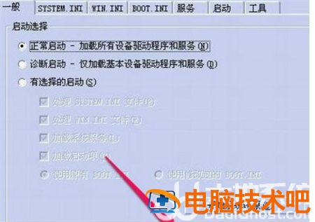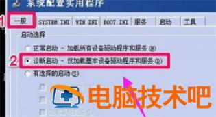 进入“系统配置”窗口后,选择“一般”,在“启动选择”下,原来选择的是“诊断启动”这一项,需要修改一下。
