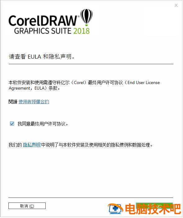 coreldraw2018用户安装许可协议,勾选我同意协议,点击接受。