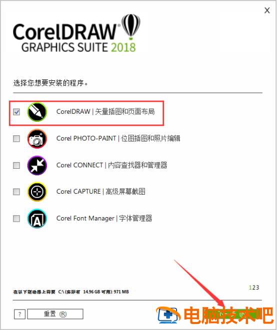 coreldraw2018有五个安装程序,可以把不想要的取消安装,如果需要也可以全部安装,点击下一步。