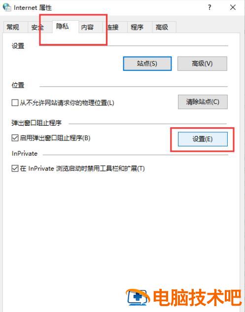 5、在“internet选项”中点击“隐私”-“设置”按钮。