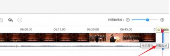 2、将鼠标移动到添加完成的转场效果,如下图所示拖动滑块,调整转场效果的终点。