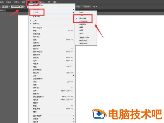 3、工作区——基本功能。点击窗口菜单栏,选择工作区,然后选择基本功能选项,打开默认的面板。