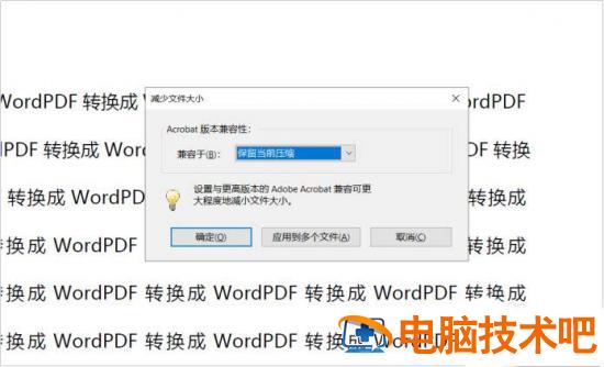 接着会出现“减少文件大小”的窗口。我们在这个窗口中默认版本的兼容性为“保留当前压缩”。点击“确定”就能够压缩PDF文件。这个方法虽然可以压缩PDF文件,不过压缩文件的速度很慢,工作效率低下。