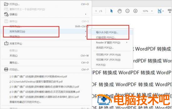 然后点击左上角的“文件”选择其中的“另存为其他”。在“另存为其他”中点击“缩小大小的PDF”功能。