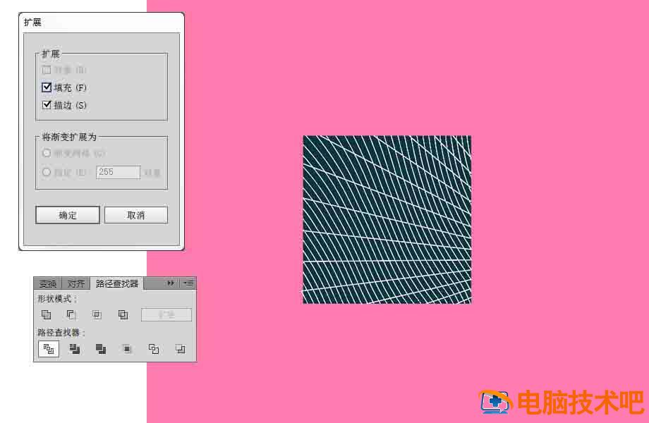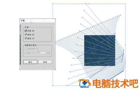 然后选中直线条和曲线条,进入【对象扩展】,扩展的选项面板中为默认设置,点击确定。这是我们运用的第一次扩展,第一次扩展是将混合的图形变为描边路径。