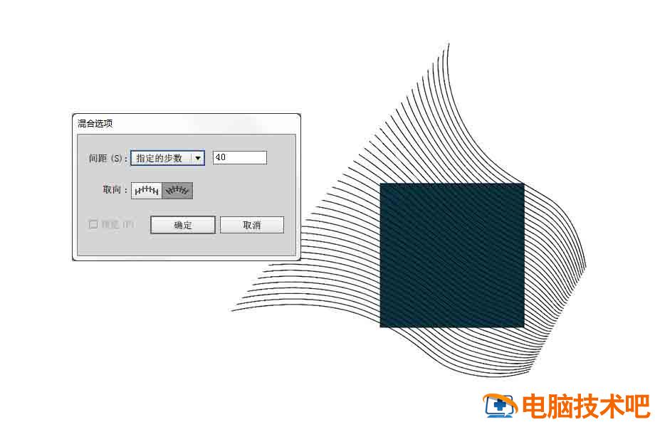 接下来再设置混合工具,指定的步数里设置40。然后选中两条曲线,运用混合工具。