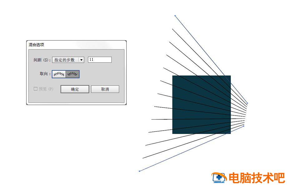 双击混合工具,弹出该工具的参数设置面板,在选项卡中选中指定的步数,数量设置为11,然后改为对齐路径。选中两条直线,进入【对象混合建立】。这时混合工具会将你的两条直线变为一排过渡的直线。混合工具的一个重要的作用就是创造两个对象之间的过渡。这需要日后不断运用体会。