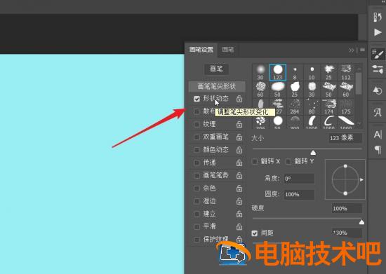 点击画笔工具,在选项栏中点击打开画笔设置面板。