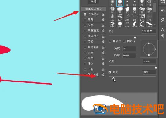 在画笔笔尖形状中调整间距,让画出的笔画能够较长。