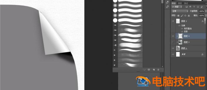 9、隐藏图片,在图片图层3上方新建图层4,并创建剪切蒙版,如图。选择柔性画笔,前景色设置为黑色,为折纸下方涂抹阴影。