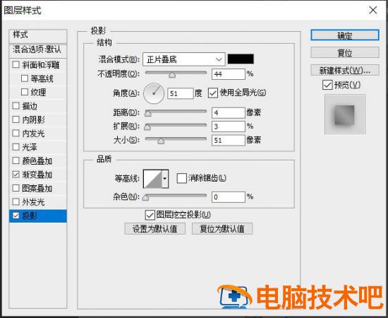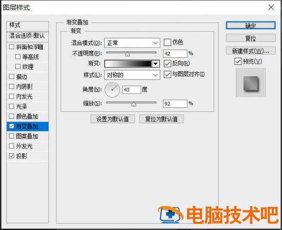7、现在开始给折纸部分制作立体效果ctrl+d取消选区,双击图层2,弹出图层样式对话框。给折纸部分添加渐变叠加和投影,适当调整参数。