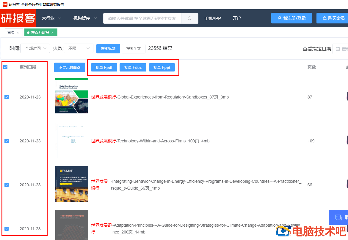 8、也可以批量勾选需要下载的研报,然后选择需要下载保存的文档类型并点击对应的按钮。