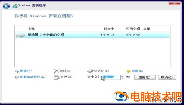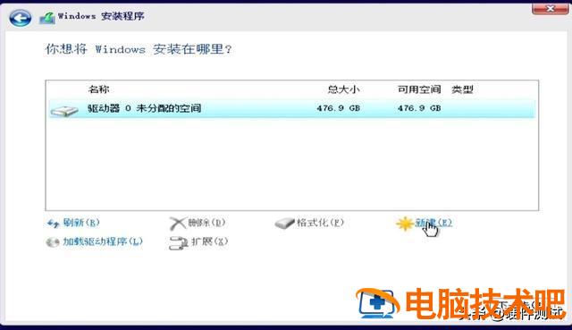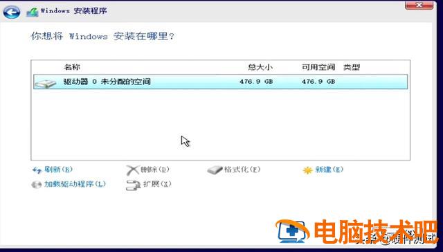 在这里,我们将看到一个未分配的空间,大小为476.9G,这是我们用来演示安装操作系统的512G固态硬盘。有人会问,为什么标称为512?G,到Wiondows就变成了476. 9G嗯,这不是硬盘制造商缩水,也不是你的卖家坑你,实际上是硬盘制造商的单位进制和Windows原因不同。新机器磁盘(如下图)