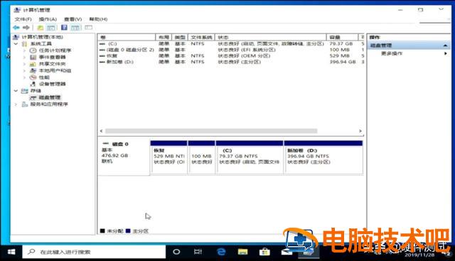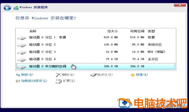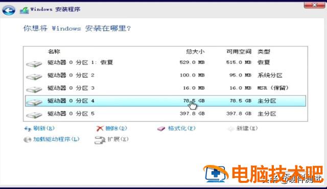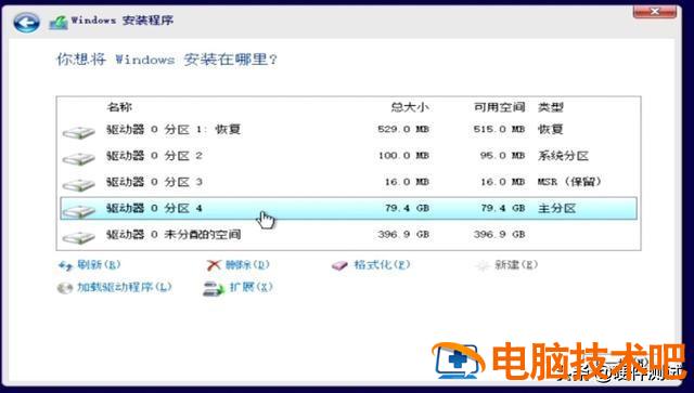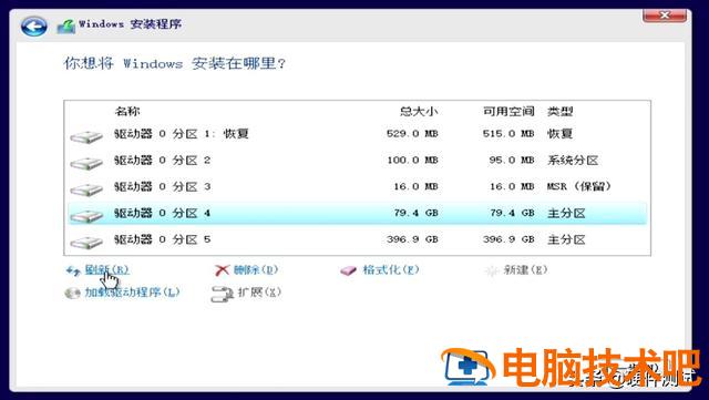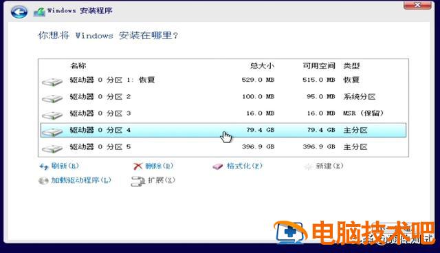 这个磁盘4是我们刚才分辨出来的80G C磁盘,以上分区1、2、3,是安装程序自动分离,这三个分区是系统安装程序必须保留的分区,不要移动他,其余396. 9G不需要分。至此,这块512G我们将固态硬盘分为两个磁盘,C盘80G, D盘396. 9G。