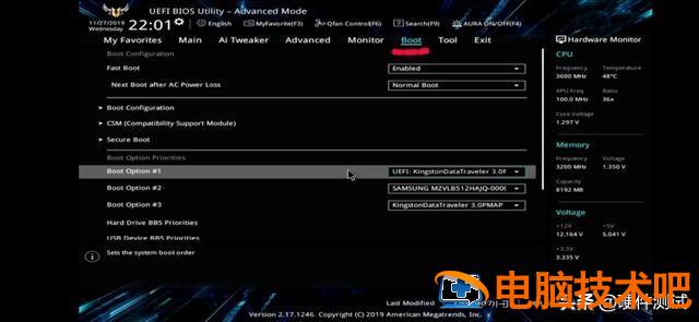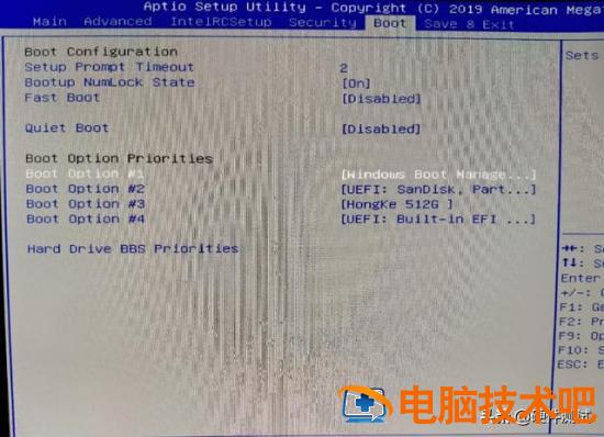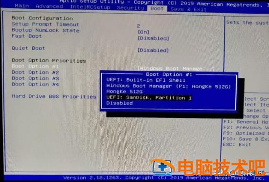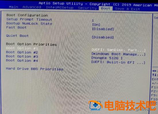 进入Boot界面,找到Boot Opt ino#1,这里的#1[windows Boot manage ]我们需要把它改成错误的选项 UEFI:SanDisk partition1 即可
