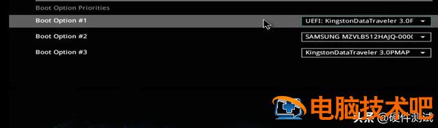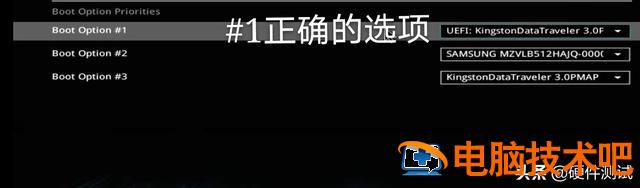 下面我们可以看到Boot Option#1 、#2、#3。三个启动选项。#1是由UEFI开头的U盘,#2是三星固态硬盘(或其他品牌的固态硬盘),#3是非UEFI开头的U盘。在这里我们选择#1做为为第一启动选项(需要注意一点,#1必须是以UEFI开头的U盘是第一个启动选项(如果你的U盘是金士顿,它显示UEFI:KingstonDataTraveler3.0.如果是闪迪的U盘英文名,那就是Sandisk,前面的英语代表你U盘的名字。)如果您的#1没有显示U盘作为第一个启动,请单击下方向的白色箭头选择UEFI开头的U盘可以作为第一个启动选项(如图2所示)。#1正确选项 如图3所示)。