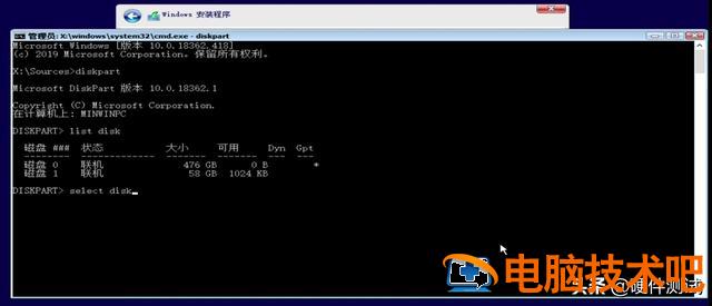 此时,您计算机中的所有磁盘都将被列出。磁盘0是固态硬盘,磁盘1是我们的U盘。在这里我们输入 select空格disk空格0 ,然后按回车。(如下图)