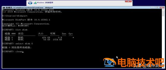 然后输入 clean 清空磁盘的所有分区。(如下图)