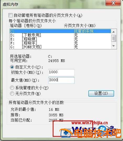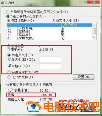 5、一般来说,系统设置界面中提供给了我们推荐的虚拟内存值,因为对于每一个驱动器都需要有一个虚拟内存的设置,对于每一个页面文件的设置,下面是常见的设置方案。一般情况下,我们只需要对C盘驱动器进行虚拟内存大小的设置,如果我们的物理内存为2GB,推荐虚拟内存的最大值设置为1.5~2倍左右即可。因此,我们点击自定义设置,然后输入相关的数值即可。
