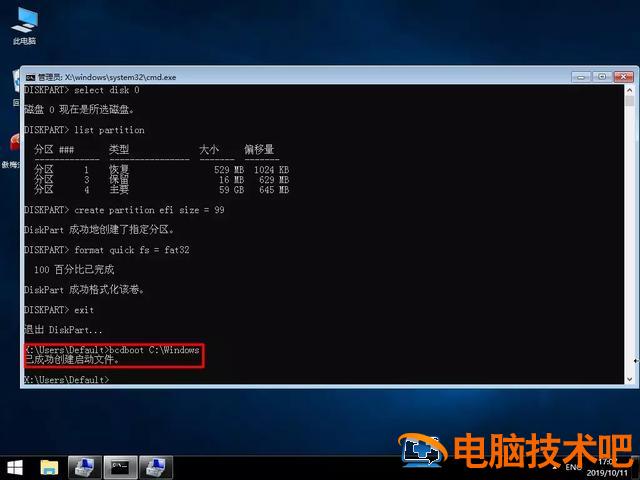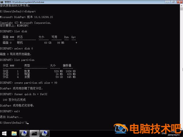 format quick fs = fat32 — 格式化EFI分区为fat32格式exit — 退出diskpart工具