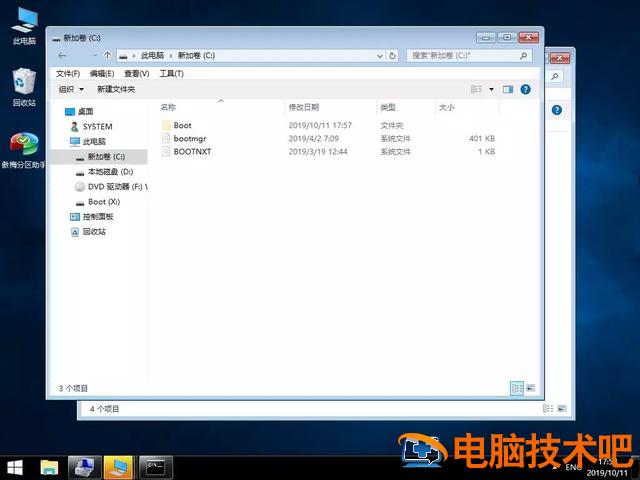 在BIOS在引导模式中,bcdboot会在MBR创建格式磁盘上的活动分区 \\Boot 将所有需要的指导环境文件复制到目录中。