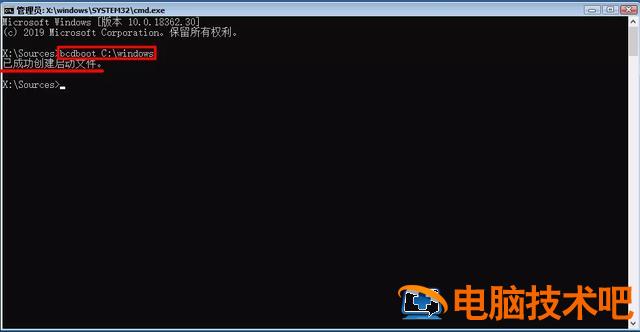 输入示例:bcdboot C:\\Windows