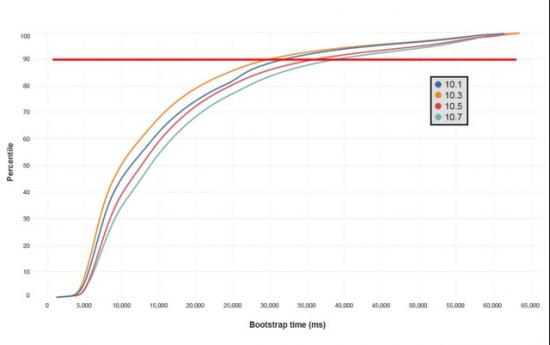 这张图里面可以看到,在红色直线标出的90%用户这个水平线上,从10.3更新版本开始一直到10.7,客户端启动时间大幅增加了,也就是说,经过这3个版本的更新后,绝大部分玩家们反而要多花5到8秒的时间等待客户端启动完成。