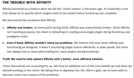 听起来好像还不错,但为什么反而更慢了。拳头解释说,这是因为这段时间玩家大量融入,给服务器造成了不小的负担和拥堵,这样下来客户端在启动时跟服务器的通信就更慢了,拖慢了启动速度。而且他们还发现,几年前搞的一个Affinity软件根本就是坏的,完全没有起到管理这些插件的责任。