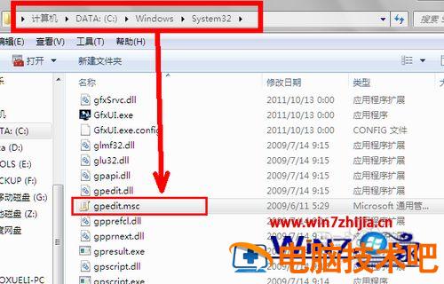5、为什么用这样的方法也能打开组策略编辑器呢?因为,组策略编辑器这个程序就在system32这个系统的文件夹中,我们输入了这个地址,也就直接打开了这个位置。所以会直接打开此编辑器。下面截一图,以便大家对这个组策略编辑器有更深入的了解。