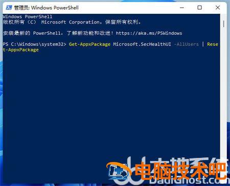 耐心等待一会,最后输入Get-AppxPackage Microsoft.SecHealthUI -AllUsers | Reset-AppxPackage