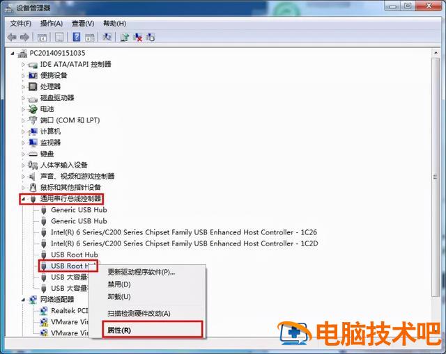 2.然后在设备管理器窗口依次点击展开通用串行总线控制器-USB Root Hub单击鼠标右键选择属性”,如下图所示: