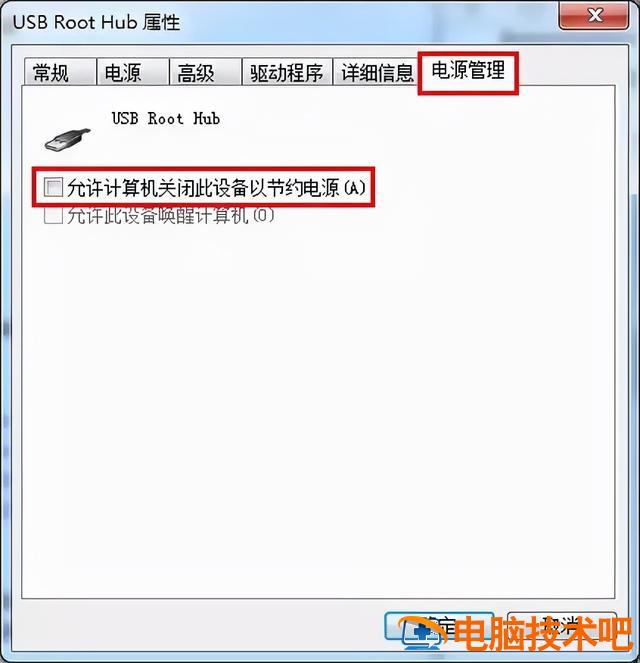 3.最后,在弹出属性设置窗口中切换到电源管理在标签下,允在节省电源之前,许计算机关闭此设备进行打钩取消,然后点击确定保存更改。